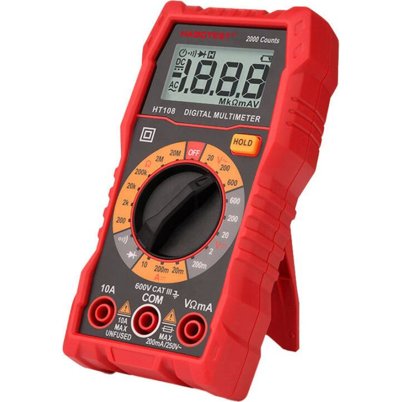 Habotest HT108L digital universal multimeterHabotest HT108L digital multimeter is a multifunctional device that will prove useful during electrical work. The product allows you to measure voltage, resistance and many other values. The multimeter has an easy-to-read display that allows you to conveniently read the measurement results, moreover, it is equipped with a flashlight and practical buttons. ![]() Many useful functionsHabotest HT108L digital universal multimeter is a handy device that surprises with the enormity of its capabilities. It allows you to measure with high precision, among other things, AC and DC voltage, resistance, continuity or capacitance. It also allows you to test diodes, and thanks to practical buttons you can efficiently select the appropriate function. ![]() Well designedThe small size of the device (130 x 70 x 23 mm) makes the multimeter fit well in the hand and provides high comfort of use. It is powered by two AAA batteries, which you can easily remove and replace. The soft material housing is pleasant to the touch, plus it provides effective insulation and is drop-resistant. ![]() Included