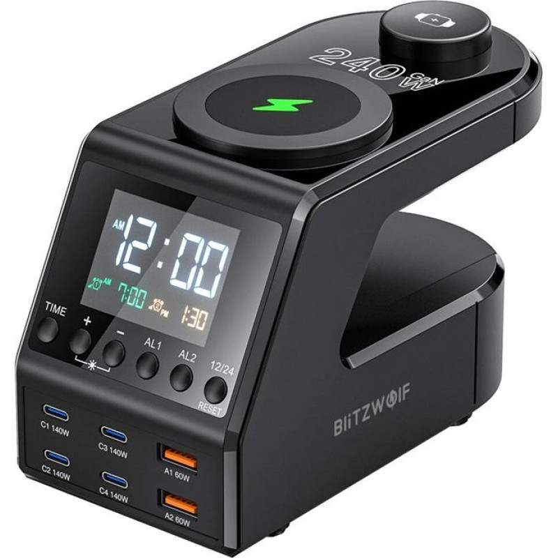Blitzwolf BW-FW10 2xUSB-A, 4xUSB-C, 240W Charging Alarm ClockThe Blitzwolf BW-FW10 is not only a stylish alarm clock with dual alarm function, but also an advanced 10-in-1 charging station that offers up to 240 watts of output power. It will conveniently and safely charge all your devices - from smartphone to laptop - in one place.