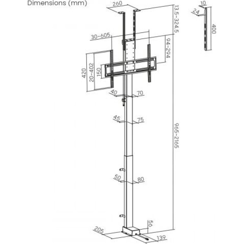 TV height adjustment from 965 - 2165 mm Stand height: 978.5 - 2489.5 mm Maximum load: 60 kg Designed for TVs with screen diagonal: from 43 to 88" Profile: 115 mm Length of power cable: 1,50 m Base dimensions: 205x139 mm