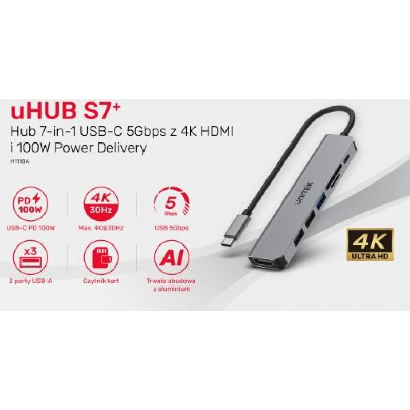 Unitek HUB USB-C 7in1 Aluminium PD 100W ; 5 Gbps