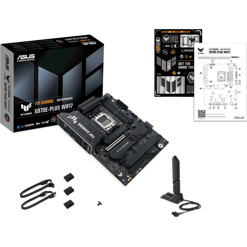 Your shopping cart is empty! | ASUS TUF GAMING X870E-PLUS WIFI7 takes all the essential elements of the latest AMD Ryzen™ processors and combines them with game-ready features and proven durability. Engineered with military-grade components, an upgraded power solution and a comprehensive cooling system, this motherboard goes beyond expectations with rock-solid and stable performance for marathon gaming. TUF GAMING motherboards also undergo rigorous endurance testing to ensure that they can handle conditions where others may fail. This platform delivers the power and connectivity that advanced AI PC applications demand. Intelligent Complete AI Solution ASUS AI Solutions – including AI Advisor, AI Overclocking, AI Cooling II for thermal control and AI Networking II for real-time bandwidth optimization – offer smart assistance, one click overclocking, efficient cooling and new levels of ultrafast connectivity. AI Advisor ASUS AI Advisor is an ASUS technical expert that's always available to answer your questions. Owners of compatible ASUS motherboards can interact with this AI-powered technology using natural language to learn more about their hardware. For DIY beginners, it can provide easy-to-understand explanations of one-click optimization features like AI Overclocking and AI Cooling II, and for seasoned PC-building veterans, it can offer guidance and instructions on the latest features offered by ASUS. * Availability of ASUS AI Advisor may vary by region. AI Overclocking Maximized CPU performance, and predictions for ideal CPU and cooling settings, pushing your system to its limits. AI Cooling II Optimized thermals, and reduced noise via dynamic adjustment of fan speeds, based on CPU temperatures. AI Networking II Optimized network performance, helping to ensure seamless connectivity and maximized WiFi 7 speeds. Intelligent Overclocking DYNAMIC OC SWITCHER Dynamic OC Switcher maximizes CPU performance by letting you set current and temperature thresholds to automatically switch between a manual overlock for heavy multithreaded workloads and Precision Boost Overdrive for single-threaded tasks. The latest Overclocking Load Guard has an enhanced instantaneous current protection mechanism to prevent users from experiencing system crashes during overclocking. CORE FLEX Core Flex empowers you to smash limits farther than ever before by letting you control power and thermals in creative new ways. In its simplest form, you can set breakpoints to gradually reduce CPU core frequency as temperature or current increases. But the system is extremely adaptable, supporting multiple user-controlled functions that can manipulate power, current and temperature limits independently so that you can bend CPU performance to your will. Intelligent Intelligent Control UEFI BIOS The UEFI interface delivers easy-to-use configuration options for PC beginners, and advanced features for veterans. ASUS DriverHub Simplify driver management with automatic detection, one-click installation and update for smooth, efficient system performance. ASUS GlideX Enable seamless screen sharing and control across PCs, tablets, and smartphones via USB or WiFi, supporting multiple platforms. Armoury Crate Customize Aura Sync RGB and control ASUS devices. Includes product registration and updates. Performance Premium Power Design Stable power is crucial for maximizing the performance of AMD processors. The motherboard is designed to meet the needs of high-core-count CPUs. It features 16(80A) + 2(80A) + 1(80A) power stages that integrate high-side and low-side MOSFETs and drivers into packages rated for up to 80A each. This configuration ensures optimal power delivery, efficiency, stability and performance for both current and future AMD processors. Eight Layered PCB design Enhanced stability and overclocking. ProCool Power Connectors Proprietary 8+8 pin connectors improve PSU connection. TUF Components TUF chokes and capacitors offer rock-solid durability and stability. Digi+VRM Control Real-time voltage control. Performance Memory & Storage DRAM Overclocking Performance Comprehensive memory tuning options are the cornerstone of TUF GAMING motherboards. With the motherboard, you can extract all the potential out of your DDR5 modules*, whether they're from an extreme-speed kit or an entry-level set that would otherwise be locked. * Memory overclocking may vary between CPU series. Please refer to the spec table for detailed information. DDR5 DOMINANCE For those who want to fly past stock DDR5 speeds, this motherboard is primed and ready for enthusiast-grade kits, courtesy of vast AMD Extended Profiles for Overclocking (EXPO™) support. Seasoned veterans can further tweak performance via an extensive array of settings in the UEFI. ASUS AEMP ASUS Enhanced Memory Profile (AEMP) is an exclusive firmware feature for PMIC-restricted memory modules. AEMP automatically detects the memory chips on your kit and then presents optimized frequency, timing and voltage profiles that you can quickly apply. M.2 PCIe 5.0 Support This motherboard also features two PCIe 5.0 M.2 slots to enjoy the fastest data transfers of up to 128 Gbps*, and all M.2 slots support NVMe RAID configurations to take advantage of the latest available speeds. Cooling Cooler by Design Cooling Cooler Compatibility ASUS AIO coolers offer robust performance, high overclocking potential, bold aesthetics and customizable functionality for new TUF Gaming motherboards, empowering you to build your dream gaming rig. Connectivity Empowering Connection This motherboard offers a versatile range of connectivity with PCIe 5.0, USB4® 40Gbps and front USB 20Gbps Type-C® connectors with Fast Charge support. PCIe 5.0 for Graphics Card PCIe 5.0 offers twice the data transfer speed of PCIe 4.0, making it robust enough to handle new data-heavy tasks. PCIe 5.0 also brings other benefits, such as electrical changes to improve signal integrity, backward-compatible CEM connectors for add-in