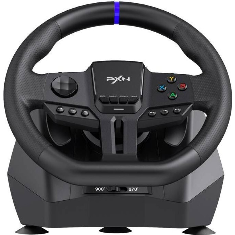 PXN-V900 Gen2 gaming steering wheelStep onto a virtual track where every turn, every gear shift and every moment features exceptional realism. The PXN-V900 Gen2 gaming steering wheel offers the precision of a 16-bit magnetic encoder that captures even the tiniest movements and multi-stage vibration. The adjustable rotation angle allows you to customize the device's action to suit any driving style. Dynamic RGB backlighting guarantees an extra layer of immersion. You'll find metal pedals with Hall Magnetic technology that excel in sensitivity and durability. The whole thing is compatible with PC, Xbox, PlayStation and Nintendo Switch.