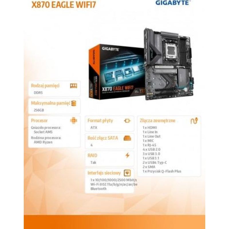 | SKU | KBGBAAA8X870A05 | | Barcode | 4719331864996 | | Model | X870 EAGLE WIFI7 | | CPU socket | Socket AM5 | | Processor family | AMD Ryzen | | Integrated CPU | No | | Chipset manufacturer | AMD | | Chipset type | AMD X870 | | Memory type | DDR5 | | Number of DDR5 slots | 4 | | Memory bus frequency | 6600 MHz | | Memory bus frequency | 6400 MHz | | Memory bus frequency | 6200 MHz | | Memory bus frequency | 6000 MHz | | Memory bus frequency | 4800 MHz | | Memory bus frequency | 5200 MHz | | Memory bus frequency | 5600 MHz | | Memory bus frequency | 7600 MHz | | Memory bus frequency | 7200 MHz | | Memory bus frequency | 7000 MHz | | Memory bus frequency | 6666 MHz | | Memory bus frequency | 6800 MHz | | Memory bus frequency | 4400 MHz | | Memory bus frequency | 7800 MHz | | Memory bus frequency | 8000 MHz | | Max memory size | 256 | | Expansion slots | 2 x PCIe 3.0 x 16 | | Expansion slots | 1 x PCIe x 16 | | Max. number of SATA devices | 4 | | RAID | Yes | | Detailed data on disk/drive interfaces | 1 x M.2 connector (M2A_CPU), integrated with the processor, supporting Socket 3, M key, type 25110/22110/2580/2280 SSDs: AMD Ryzen 9000/7000 series processors support PCIe 5.0 x4/x2 SSDs AMD Ryzen 8000-Phoenix 1 series processors support PCIe 4.0 x4/x2 SSDs AMD Ryzen 8000-Phoenix 2 series processors support PCIe 4.0 x4/x2 SSDs 1 x M.2 connector (M2C_SB), integrated with the chipset, supporting Socket 3, M key, type 25110/22110/2580/2280 PCIe 4.0 x2 SSDs1 x M.2 connector (M2B_SB), integrated with chipset, supporting Socket 3, M Key, type 25110/22110/2580/2280 PCIe 4.0 x4/x2 SSD drives | | Graphics | Integrated graphics processor with AMD Radeon Graphics support + ASMedia USB4 controller 2 x USB4 USB Type-C ports, supporting USB4 and DisplayPort video outputs and a maximum resolution of 3840x2160@240 Hz Integrated graphics processor - AMD Radeon Graphics support 1 x HDMI port, supporting a maximum resolution of 4096x2160@60 Hz | | Network interface | 1 x 10/100/1000/2500 Mbit/s | | Network interface | Wi-Fi 802.11a/b/g/n/ac/ax/be | | Network interface | Bluetooth | | Network interface | Realtek 2.5GbE LAN chip (2.5 Gbps/1 Gbps/100 Mbps)MediaTek Wi-Fi 7 MT7925 (PCB rev. 1.0) 802.11a, b, g, n, ac, ax, be, supporting 2.4/5/6 GHz carrier bands BLUETOOTH 5.4 Support for 11be 160MHz wireless standard Realtek Wi-Fi 7 RTL8922AE (PCB rev. 1.1) 802.11a, b, g, n, ac, ax, be, supporting 2.4/5/6 GHz carrier bands BLUETOOTH 5.4 Support for 11be 160MHz wireless standard | | USB ports at back panel | 10 | | USB ports on motherboard | 8 | | Number of USB 3.0/USB 3.1 gen 1/USB 3.2 gen 1 ports | 5 | | Number of USB 3.1/USB 3.1 gen 2/USB 3.2 gen 2 ports | 5 | | FireWire (IEEE 1394) | No | | COM connector / port | No | | LPT connector / port | No | | External connectors | 3 x USB 3.0 | | External connectors | 1 x RJ-45 | | External connectors | 2 x USB4 Type-C | | External connectors | 4 x USB 2.0 | | External connectors | 1 x MIC | | External connectors | 1 x Line Out | | External connectors | 1 x HDMI | | External connectors | 1 x Line In | | External connectors | 2 x SMA | | External connectors | 1 x USB 3.1 | | External connectors | 1 x Q-Flash Plus button | | Onboard connectors | 4 x 4pin Chassis fan | | Onboard connectors | 1 x 4pin CPU fan | | Onboard connectors | 1 x 4pin CPU/Water Pump Fan Connector | | Onboard connectors | 1 x Front panel audio header | | Onboard connectors | 1 x Clear CMOS jumper | | Onboard connectors | 1 x Power button | | Onboard connectors | 1 x TPM header | | Onboard connectors | 1 x System panel header | | Onboard connectors | 2 x USB C | | Onboard connectors | 1 x 4pin 12V power | | Onboard connectors | 1 x 8pin 12V power | | Onboard connectors | 1 x 24pin ATX zasilanie | | Onboard connectors | 3 x M.2 | | Onboard connectors | 4 x USB 2.0/1.1 | | Onboard connectors | 2 x USB 3.1 | | Onboard connectors | 4 x SATA III 6Gb/s | | Onboard connectors | 1 x Reset button | | Onboard connectors | 1 x Reset jumper | | Onboard connectors | 1 x RGB LED strip header | | Onboard connectors | 3 x Addressable LED | | BIOS | 1 x 256 Mbit flash Using licensed AMI UEFI BIOS PnP 1.0a, DMI 2.7, WfM 2.0, SM BIOS 2.7, ACPI 5.0 | | Form factor | ATX | | Dimensions | 30.5 x 24.4 cm | | Supported operating systems | Windows 11 | | Software | Norton Internet Security (OEM version) LAN bandwidth management software | | Designation | CE+WEEE |
