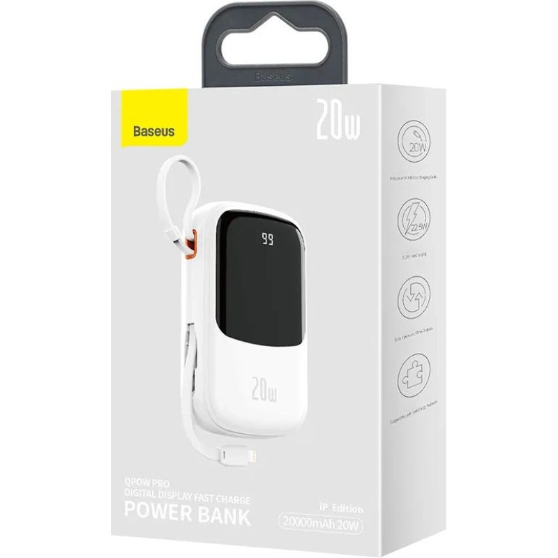 Baseus Qpow PRO powerbank with USB-C cable, USB-C, USB, 20000mAh, 20W (white)Opt for a capacious powerbank from Baseus and charge your devices quickly and safely. Baseus Qpow Pro has a built-in Lightning cable and offers 2 ports: USB-C and USB. It also supports multiple fast charging protocols. It allows you to renew the energy of 3 devices simultaneously. Its output power reaches 20 watts and its capacity is 20,000 mAh. Thanks to the fact that it is handy and lightweight, transporting it is not a problem. The product is also distinguished by its wide compatibility and multi-level protection.