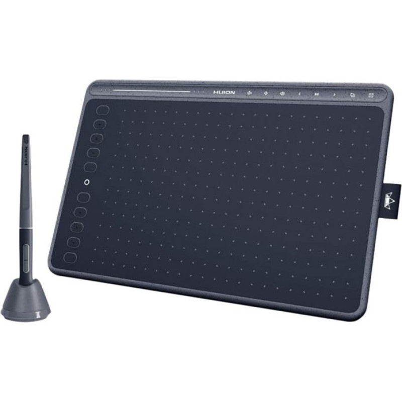 Graphic Tablet Huion HS611The Huion HS611 is a graphics tablet with a working surface of 258.4 x 161.5 mm that weighs just 550 g and is 7.3 mm thick, making it suitable for both desktop and outdoor use. It supports 8192 pressure levels and detects the tilt of the stylus up to ±60°, allowing it to accurately reproduce every hand movement. A reporting rate of over 233 PPS and a resolution of 5080 LPI ensure smooth, accurate operation without lag. The device features 10 programmable keys and a touch bar, as well as a separate media bar for music control. A USB-C port is used for connection. The hardware is compatible with Windows, macOS, Android and Linux.